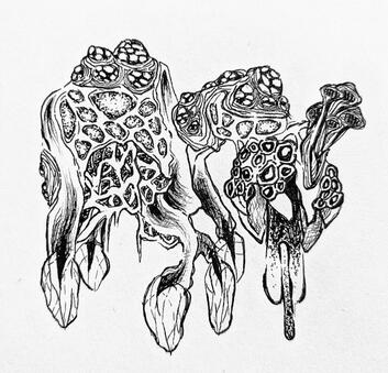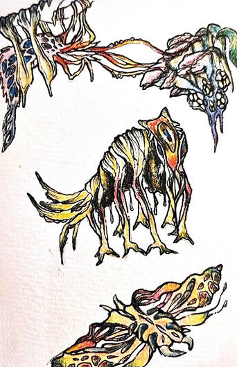 Hi, I'm Shark Queen. I specialize in heavily inked colorful creature art and abstract pieces, mixing watercolor, ink and digital.